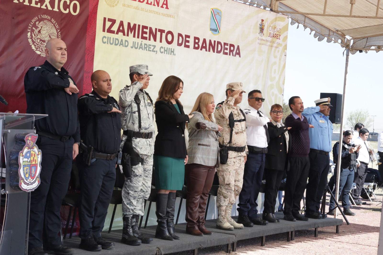 Con la participación de corporaciones de seguridad de los tres órdenes de Gobierno y alumnos de la Escuela Primaria Chihuahua, se llevó a cabo la penúltima ceremonia de izamiento de bandera en la Megabandera, ubicada en la avenida Heroico Colegio Militar en la zona de El Chamizal. Como parte del evento se rindieron los honores a la bandera, se dio lectura a las efemérides del mes de noviembre y se entonó una melodía por parte de la Banda de Música del Municipio. Martha Aracely González Holguín, directora de Educación del Municipio, señaló que mes con mes se realiza esta ceremonia que tiene como principal fin promover los actos cívicos entre estudiantes de todos los niveles de educación y cada día son más las escuelas que solicitan participar en esta actividad. “Agradecer a las diferentes corporaciones que hoy engalanan este evento y a la Secretaria de la Defensa Nacional, con quienes de manera coordinada se pueden llevar a cabo estos eventos cívicos que exacerban valores en los corazones de los juarenses”, destacó González Holguín. Resaltó que entre las fechas más importantes de este mes está la conmemoración de la Revolución Mexicana, el 20 de noviembre, fecha que muestra el compromiso de los héroes que dieron la libertad y justicia para nuestro país. Al izamiento de bandera acudió la presidenta del Sistema para el Desarrollo Integral de la Familia, Rubí Enríquez; el Coronel de Caballería Fermín Vargas González, Comandante del Noveno Regimiento de Caballería Motorizado; Edgar Soto Lizárraga, coordinador del 31 Batallón de la Guarida Nacional; subsecretario de Despliegue Policial, Simeón Esparza y Víctor Rosario, director operativo de la Secretaria de Seguridad Pública Municipal. También se contó con la presencia del regidor Jorge Marcial Bueno Quiroz; la Sindica Municipal, María Esther Mejía Cruz; el comandante del Heroico Cuerpo de Bomberos, Sergio Rodríguez y el comandante Víctor Manuel Mejía, coordinador operativo de Seguridad Vial, así como otros funcionarios municipales, personal docente y padres de familia de la Escuela Primaria Chihuahua. Navegación de entradas Realiza personal del SUTM labores de limpieza al norte de la ciudad Más de 208 mil personas visitaron los panteones municipales
