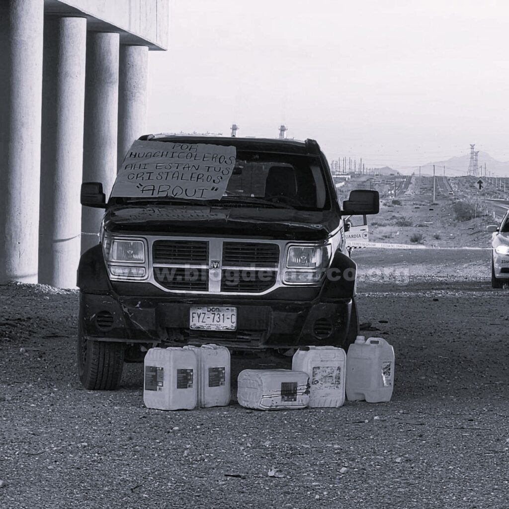 Frente al vehículo antes citado, fueron dejados varios BIDONES blancos de 20 litros, lo que reveló la versión extra- oficial del involucramiento de los EJECUTADOS en actividades del HUACHICOL, como lo describía la CARTULINA pegada al vidrio frontal de la camioneta.